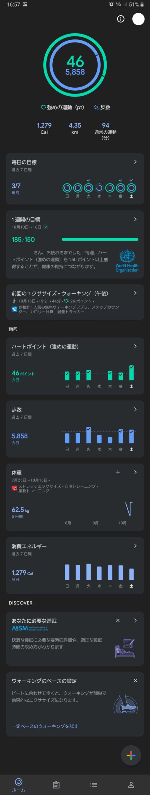 Google Fit アプリで日々の運動を管理できます。Google Fit アプリを起ち上げると「ハートポイント(強めの運動)」と「歩数」がパッと確認できます。以下の画像は今日のハートポイントが46、歩数が5858と分かります。目標数値を設定でき「毎日の目標」や「ハートポイント」「歩数」の一週間のサマリーが確認できます。