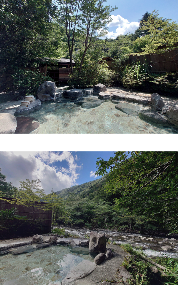 - 渓流露天風呂は、180度の開放感ある露天風呂で、天井は空までありません。四季折々の自然の風景と自然の音、香りを五感で感じることができます。
