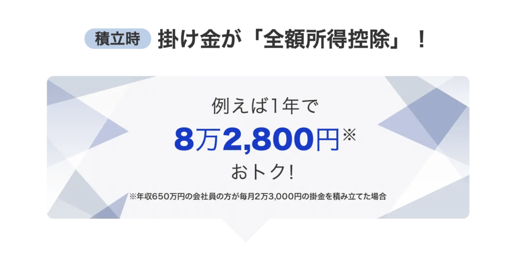 ○ 掛金全額が所得控除の対象となり、仮に毎月の掛金が1万円の場合、所得税(10%)、住民税(10%)とすると年間2.4万円、税金が軽減されます。